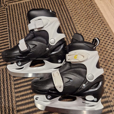 Graf lasten säädettävät luistimet, koko noin 31. Väri musta–valkoinen–sininen. Luistimissa on säädettävä kokoalue, joka on merkitty runkoon (esim. 31 ja viereiset koot). Varressa on 3M Thinsulate -eriste, joka parantaa lämmöneristystä. Kiinnitys tapahtuu solki- ja nauhakiristyksellä. Sopivat yleiseen luisteluun lapsille.