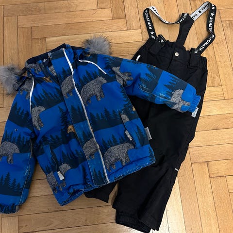 Myydään poikien paksut toppahaalarit koko 110. Mustat osat vahvempaa.