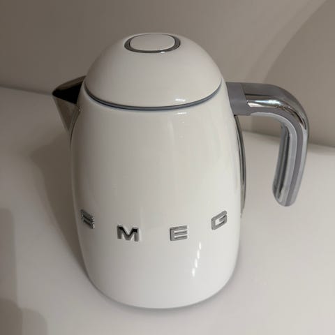 Smeg vedenkeitin vaaleanpunaisella rungolla ja tummalla kahvalla. Sähkökäyttöinen vedenkeitin, jossa on kannellinen yläosa ja kaatonokka. Retrohenkinen muotoilu ja metalliset Smeg-logot rungon sivuilla. Keittiö uudistuksen tarpeessa, jiten joutaa pois