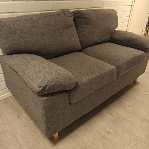 Hyvä kuntoinen, kaksipaikkainen sohva tummanharmaalla kangasverhoilulla. Sohvassa on leveät käsinojat, kaksi istuintyynyä ja kaksi selkätyynyä. Suorat linjat ja matalat jalat. Sopii olohuoneeseen tai esimerkiksi vierashuoneeseen istuma- ja oleskelukäyttöön. Ei kuljetusta.