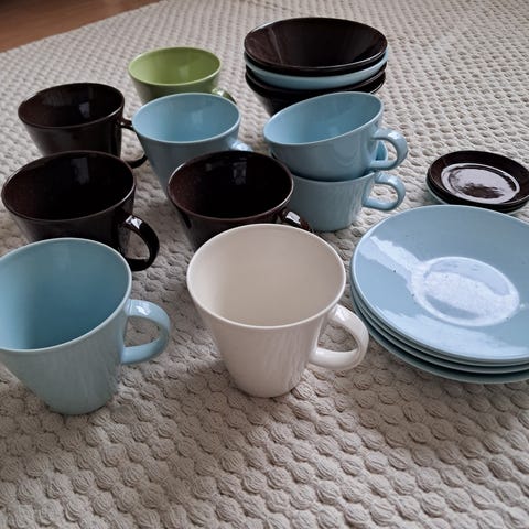 Aquan värisiä, osin käyttämättömiä, uuden veroisia Koko-astioita. 4 kpl lautasia 28cm, 4 kpl lautasia 23cm sekä 3 kpl kulhoja.