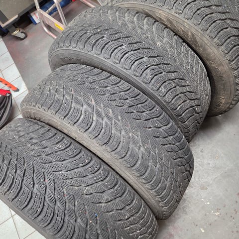 Hyväkuntoiset ja tuoreet huippulaadukkaat kitkarenkaat ns. staggered settinä, jossa edessä kapeammat ja takana vähän leveämmät renkaat.