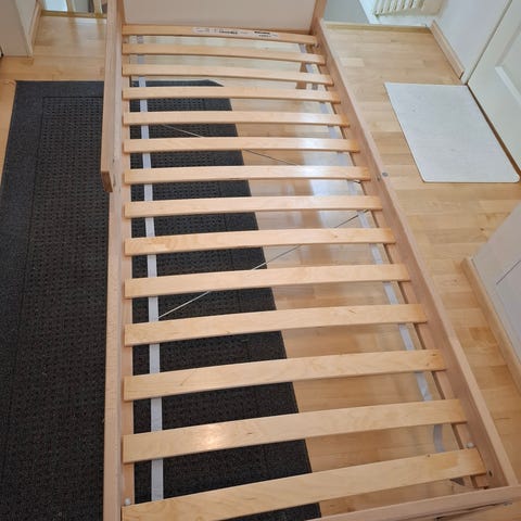 Hyvässä kunnossa oleva juniorisänky. Laatikostoon saa kätevästi leluja/vaatteita yms piiloon. Mukaan kuuluu puolen sängyn mittainen turvakaide ja halutessa patja.
