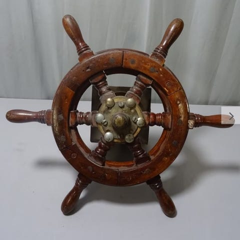 Puinen melko painava veneen ruori. Luultavasti tiikkiä ja messinkiä. Ollut koristeena seinällä. En itse osaa sanoa soveltuuko käyttöön. Keskiön sisälle merkattu kirjain S, uskoisin valmistajan olevan Stazo. Halkaisija 450mm.