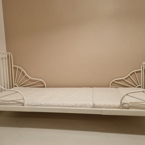 min pituus 137cm ja maksimi pituus 207cm. mukaan sängyn koon mukaan sopivat patjat. voi purkaa osiin.kulkeutuu kyydissä sovitusti muuallekin.