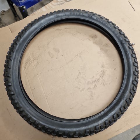 Hyväpitoinen rengas mopoon tai pienempään moottoripyörään. Säilytetty sisätiloissa, varjossa.