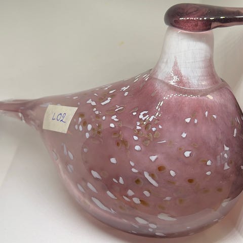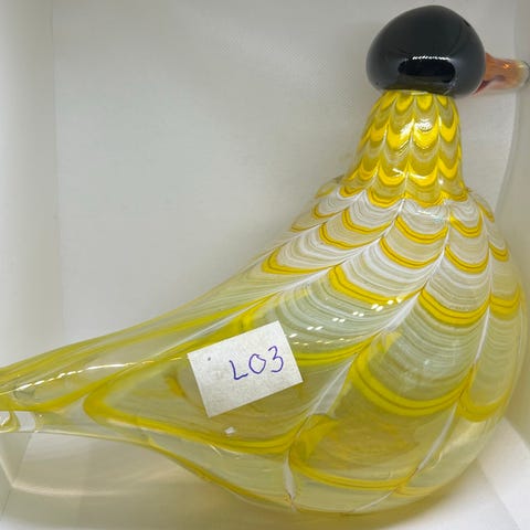 Lasilintu vihreä raidallinen, pit. 17 cm x kork. 12 cm, Taikayön Lasipaja / Uutela-tyyli, ei signeerattu, hyväkuntoinen.
