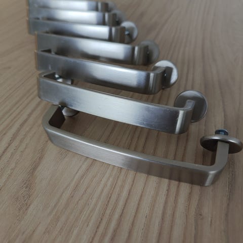 28 kpl Clas Ohlsonin harjattua terästä olevia lankavetimiä. Reikäjako 128 mm. Kahdet eripituiset ruuvit mukana.