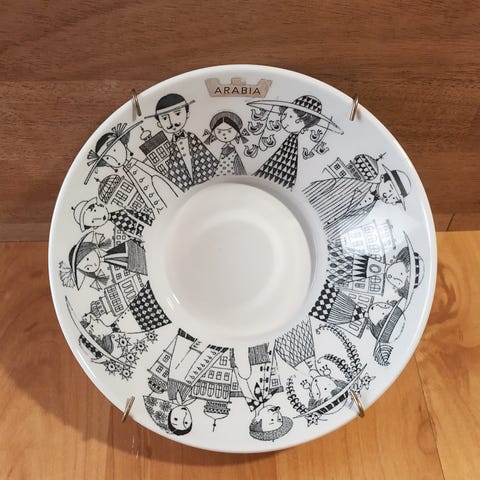Kiva emalisetti, jossa on kaksi mukia ja tarjoilulautanen.