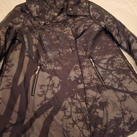 Takissa on harmaan ja mustan sävyinen camo-henkinen kuviointi, joka tuo särmää ja erottuu edukseen perusmustien takkien joukosta. Materiaali on laadukasta, kuten Marimekolta sopii odottaa. Leikkaus on suora ja reilu, sopii hyvin L-kokoiselle tai jos tykkää käyttää takkia vähän rennommin.
