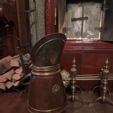 Näyttävä setti 1900-luvun alun hiili- tai tuhkasankoja, johon aikoinaan kerättiin tulipesästä hiilet. Näissä kaikissa on samanlaiset emaliset kädensijat ja koristeelliset messinkiset leijonanpäät kantokahvan alaosassa.