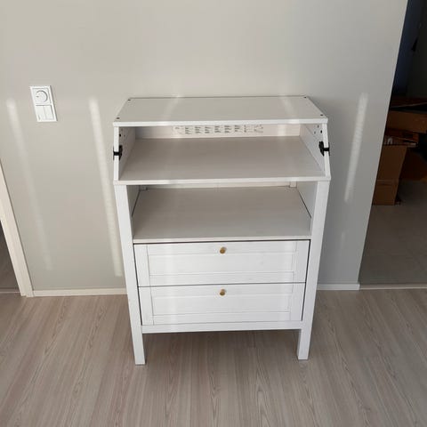 IKEA Sundvik hoitopöytä/lipasto valkoinen. Lipasto toimii hoitotasona ja vaippa-ajan jälkeen tason voi nostaa ylös, jolloin kaluste toimii myös tavallisena lipastona. Yläosassa on avohylly ja alaosassa kaksi vetolaatikkoa säilytystä varten. Hyllyosissa pientä kulumaa reunoissa maalipinnassa, muuten hyvässä kunnossa. Mielellään nouto kasattuna.