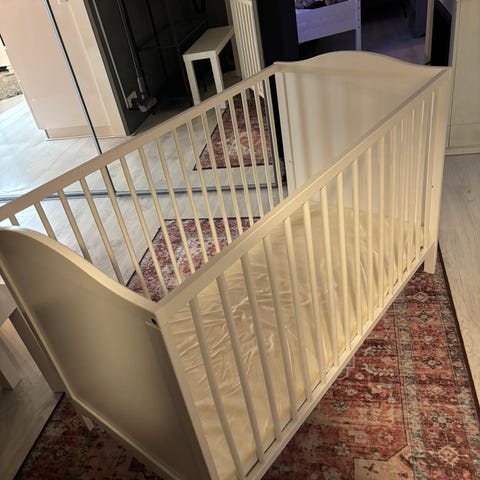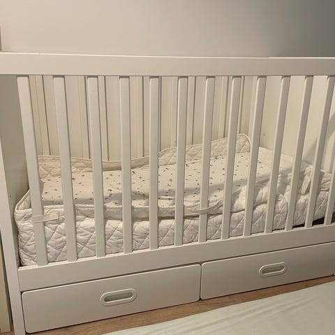 Sängyn sisällä oleva beige kangas kuuluu oikeasti alle tarvikekoriksi – laitoin sen väliaikaisesti sängyn sisään säilytystä varten.