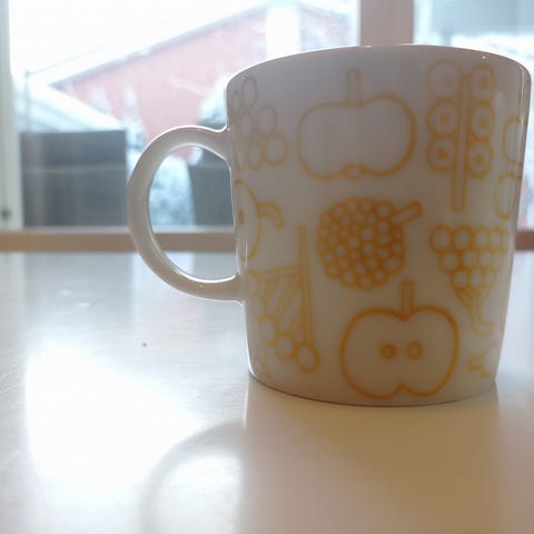 Uudet, täysin käyttämättömät 2 Iittalan keltaista Frutta mukia. Mukeissa on kaikki Iittalan tarrat. Mukien hedelmäaiheisen koristelun on suunnitellut Oiva Toikka. Mukien korkeus on 8,6 cm, yläosan halkaisija 8 cm ja vetoisuus 0,3l. Mukit ovat konepesun-, mikron- ja uuninkestävät. Yhteishinta 2 mukille ilmoituksessa.