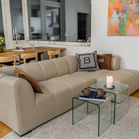 Käytössä ollut sohva, verhoilussa pieni tahra (kuvassa divaaniosan päädyssä näkyy). Tekstiilipesurilla tahra helppo poistaa. Rakenne ehjä, osat pysyvät hyvin kiinni. Istumamukavuus hyvä - sopivan jämäkkä, ei liian pehmeä.