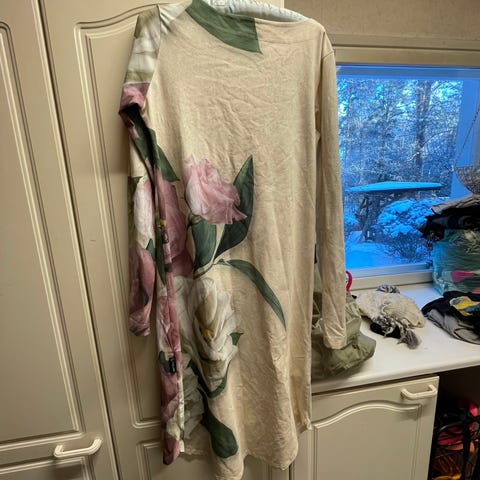 Kai-kai n 52 cm ja olka-helma n 117 edestä ja takaa niskasta helmaan n 123 cm. Materiaali joustaa reippaasti. Vyötärön kohdalla leveys n 57 cm. Itselleni valitettavasti vähän liian ahdas. Tästä kesäkaduille monikäyttöinen mekko vaikka farkkutakin ja tennareiden kanssa.