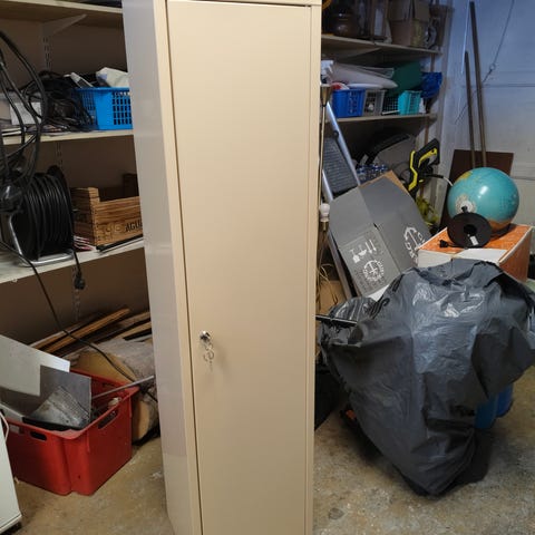 Kolmelle aseelle tarkoitettu metallinen kaappi Kaapin avaimet olivat hukassa ja ovi piti saada auki, joten jouduttiin käyttämään tiirikkaa. Ovi pelaa hyvin, mutta lukko ei.