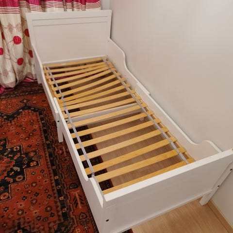 Hyväkuntoinen ja tukeva Ikean puinen lastensänky sälepohjalla ja Underlig-patjalla. Patjan koko 70 x 160.