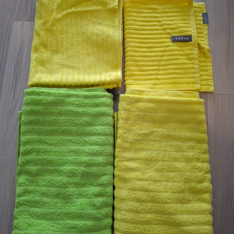 Myydään kuvien ehjät,siistit ja vähän käytetyt pyyhkeet. Käsipyyhkeitä on 4 kpl. joista 3 on Finlayson ja 1 Luhdan valmistamat. Kylpypyyhe on Finlayson.