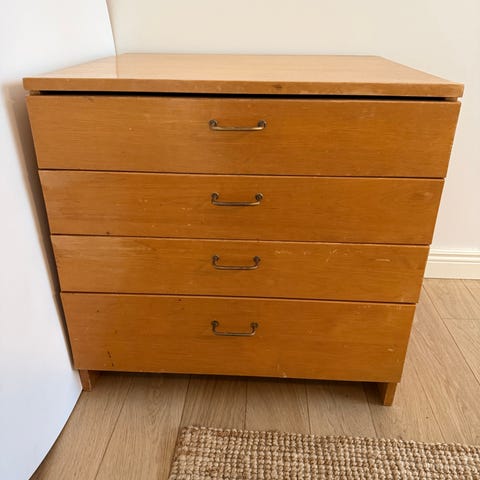 Kompakti ja juuri uuden lakkapinnan saanut lipasto sopii kokonsa puolesta mainiosti esimerkiksi eteiseen tai toimii olohuoneessa sivupöytänä, miksei myös makuuhuoneessa yöpöytänä. Lipasto on hyvässä vintagekunnossa. Lukko on poistettu kokonaan.