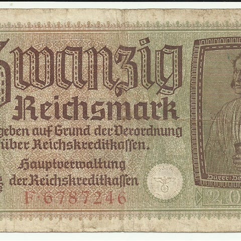 Saksan 5 Reichsmark seteli 1940-1945. Etupuolella teksti "Fünf Reichsmark" ja muotokuvakuvat, alareunassa sarjanumero punaisella. Kääntöpuolella rakennusaiheinen kuva koristeellisella kehyksellä. Soveltuu esimerkiksi keräilyyn tai historialliseksi esineeksi. hinta 2 e posti 2.50 e