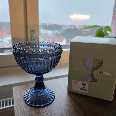 Iittalan valmistama Mariskooli sade, jonka korkeus on 155 mm. Väri oli tuotannossa v. 2014-22. Kulhossa on koristeellinen muotoilu ja se on valmistettu tummansinisestä lasista.