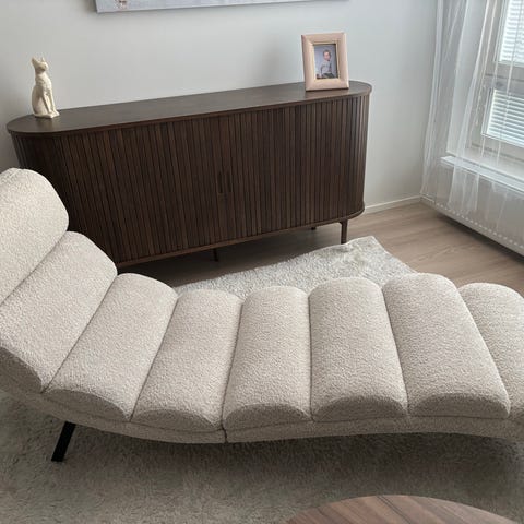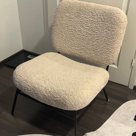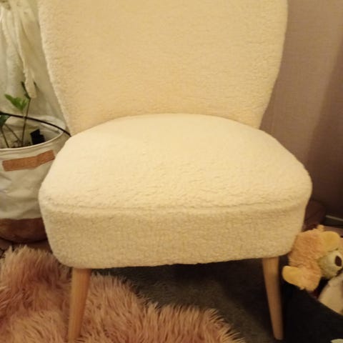 Lämpöisenvalkoinen teddy tuoli. Kangas painunut ns kasaan niistä kohdista enemmän missä on istuttu. Myös kuvassa oleva pampaheinä/maljakko on myynnissä erikseen hintaan 15€