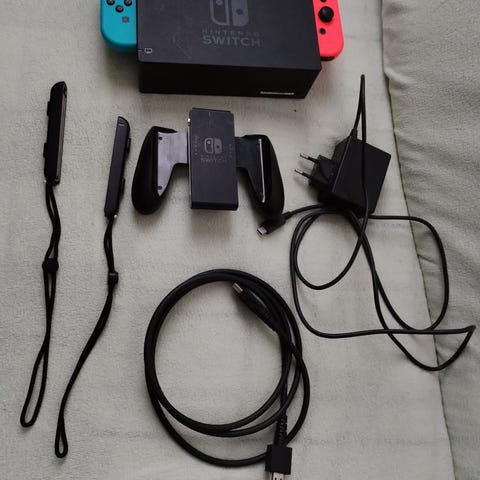Nintendo Switch -pelikonsoli. Kannettava ja telakoitava pelikonsoli, jossa irrotettavat ohjaimet. Kuvissa näkyy konsoli, telakka, ohjainpidike ja virtalähde. Sopii Nintendo Switch -peleille ja mahdollistaa pelaamisen sekä televisioon liitettynä että käsikonsolitilassa.