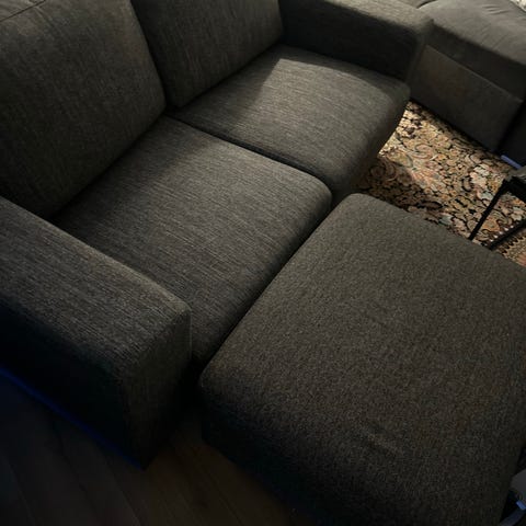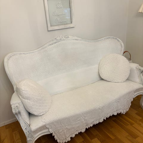 Valkoinen sohva ja rahi. Käytön jälkiä/kulumia istuinosassa. Rahin mitat pituus noin 110cm ja levey 60cm. Saattaa heittää parilla sentillä.