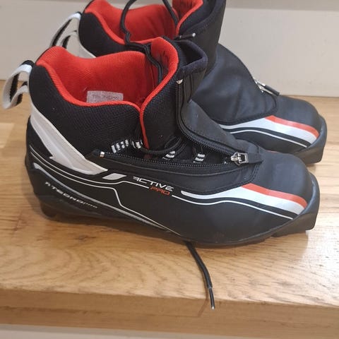 Tecno Pro Active hiihtomonot SNS Profil -siteille. Monot ovat mustat valkoisilla yksityiskohdilla ja niissä on nauhakiinnitys. Päällinen on synteettistä materiaalia ja sisäosa pehmustettu mukavuuden ja lämmöneristyksen parantamiseksi. Pohjassa SNS Profil -merkintä, yhteensopiva vastaavan järjestelmän siteiden kanssa. Soveltuvat perinteisen tyylin maastohiihtoon.