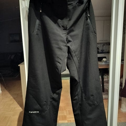 Myydään vähälle käytölle jääneet lasketteluhousut. Joustavat säädettävät olkahihnat. Pieni repeämä kankaassa lahkeessa, pestyt ja eheät muuten.