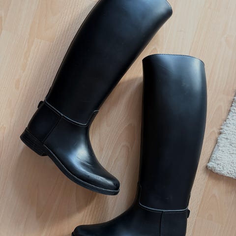 Aigle ratsastussaappaat, koko 36, kapeahko varsi. Väri musta. Materiaali kumia, tasainen kumipohja. Polveen asti ulottuva malli, jossa sileä pinta ja pyöreähkö kärki. Sopivat ratsastukseen ja muuhun ulkoiluun sateisissa ja kosteissa olosuhteissa. Hyvässä käytetyssä kunnossa.