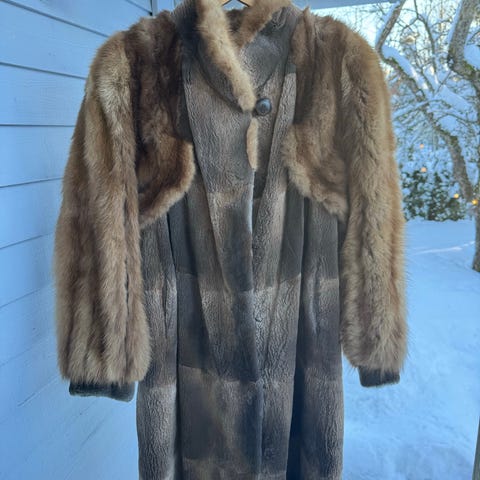 Kaunis sinisävyinen turkki kojoottia. Ei valmistaja- eikä kokomerkintöjä. Neljä hakasta ja kauluksessa nätti nappikiinnitys. Sivussa taskut. Ainoa moite on kuluma helman sisäpuolella (katso kuva). Se on korjattavissa eikä näy käytössä. Pussimaiset hihat, olkatoppaukset. Koko L - XL.