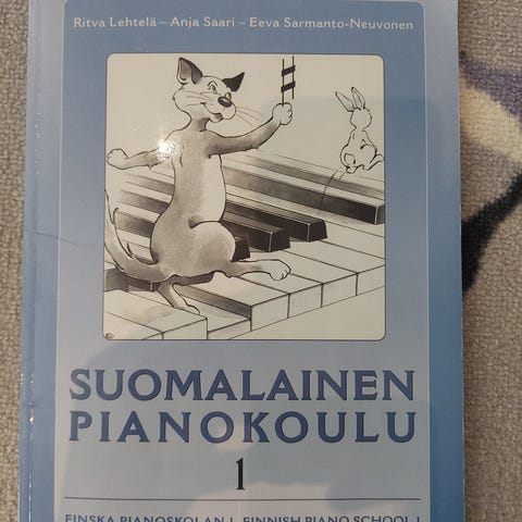 Suomalainen pianokoulu 1 - kirja. Muutamilla sivuilla on ollut lyijykynämerkintöjä, ne on kumitettu pois. MMM
