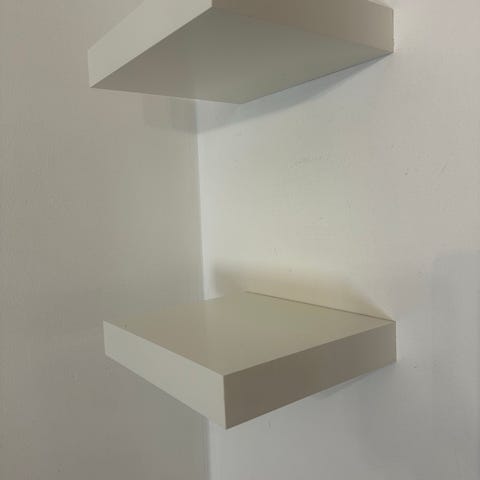 Kolme kappaletta pieniä lack hyllyjä. Yhdessä ainakin pienen pieni kolhu (kuvassa). Kolmaskin löytyi (ei kuvissa).
