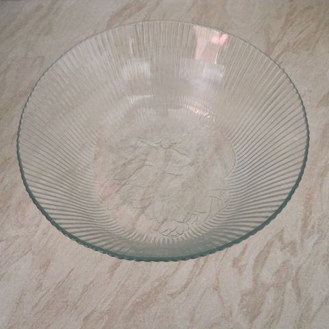 Lasinen kulho, pohjassa kukkakuvio, ehyt. Halkaisija 24cm ja korkeus 10cm.