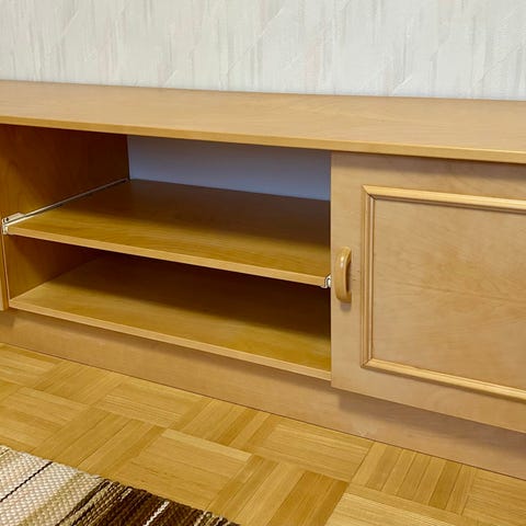 Tv-taso vaaleaa puuta. Tasossa on pitkä yhtenäinen kansilevy ja alla avoimet hyllyt, jotka soveltuvat esimerkiksi mediakuluttimien, kirjojen tai säilytyslaatikoiden sijoittamiseen. Sopii olohuoneeseen television ja oheislaitteiden alustaksi.