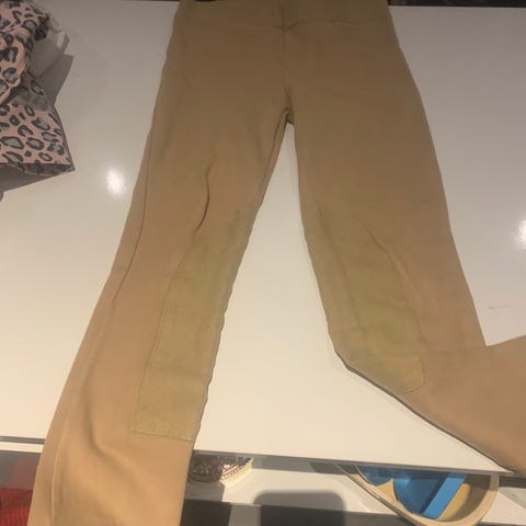KIDSin 100cm kesäratsastushousut aloittelevalle ponitytölle. Ehjät ja perussiistit. Satulan kosketusalueelle jäänyt väriä satulan nahasta.