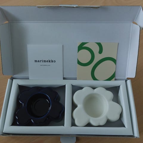 Myydään uusi ja käyttämätön Marimekon koboltinsininen kynttilälyhty. Valmistettu valkoisesta keramiikasta, jossa on sininen lasite. Tuote juhlistaa Unikko-kuvion 60-vuotisjuhlavuotta ja siinä on juhlavuoden kohokuvioitu pohjaleima. Koko: 10 x 3 cm.