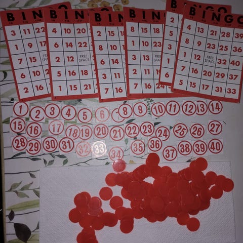 Kerran kasattu kuvausta varten, kaikki tallella. Vihreät nappulat vielä paketissa. Bingo lotto laput irrotettu toisistaan.