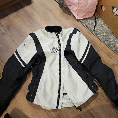 Hyvin vähän käytetty. Koko 38, naisten moottoripyörätakki. Irrotettava vuori ja liitettävissä vetoketjulla housuun.