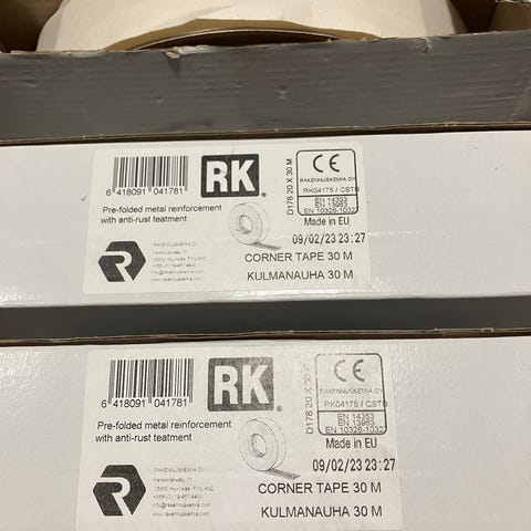 Myydään kaksi erilaista kulmanauharullaa kipsilevytöihin. Molemmat ovat CertainTeed/Saint-Gobain -konsernin tuotteita, mutta eri mallia. Rullat ovat avattuja ja väjän käytettyjä, mutta täysin käyttökelpoisia sekä melkeinpä täydet jäljellä. Sopivat sisä- ja ulkokulmiin, ikkuna- ja oviaukkoihin sekä kaareville pinnoille