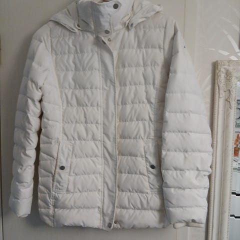 Tommy Hilfiger Denim naisten untuvatakki koossa M mutta vastaa ennemmin S kokoa. Pitkä, tikattu malli, jossa valkoinen väri. Takissa on untuvatäyte ja edessä vetoketjukiinnitys painonapeilla. Hupullinen selkäpuolelta hieman vyötäröltä kavennettu malli. Soveltuu naisten ulkovaatteeksi viileään säähän.