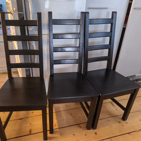 Annetaan valkoiset pinottavat Ikean tai Jyskin ruokapöydän tuolit, 3 kappaletta. Kunto kohtalainen.