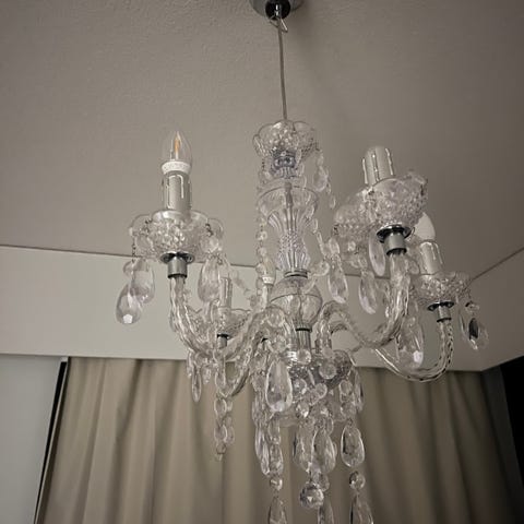 Kaunis ja erittäin kirkkaasti valaiseva kristallikruunu/kattokruunu. Polttimot (5 kpl) kaupan päälle, joskin yksi palaa muita himmeämmin.