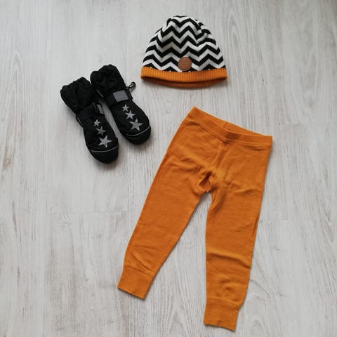 Välikerrossetti, jossa Lindexin fleecetakki kokoa 98 ja mini C:n (Cubus) merinovillahousut kokoa 86. Housut sopivat kokoon 98 saakka lapsella, ovat siis tilavat ja venyvää neulosta.
