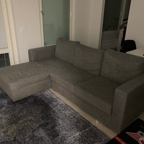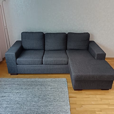 Myydään tummanharmaa Jyskin divaanisohva uuden alta pois. Sohva on ollut muutaman vuoden käytössä, ja näkyvää kulumaa löytyy.