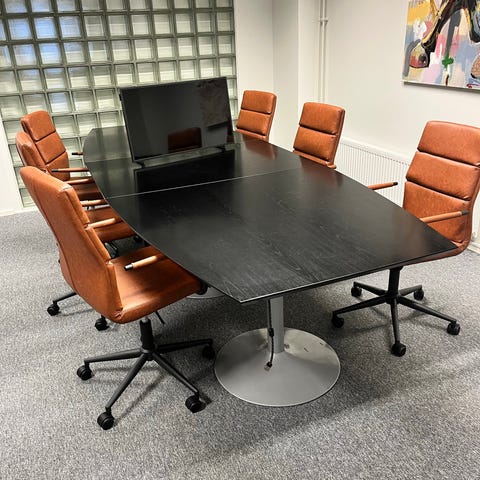 Toimistopöytä, jossa suorakaiteen muotoinen kansi ja useita läpivientejä johdoille. Pöydän pinta on puujäljitelmää, sävyltään vaalea tai keskiruskea. Soveltuu työpöydäksi toimistoon tai kotityöpisteeseen, tarjoten tilaa tietokoneelle, näytölle ja muille työvälineille. Pöytiä on kaksi. Mitat 180x80x80