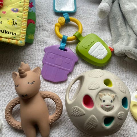Setti Vauvan helistimiä ja puruleluja. Siisti käytetty kunto. On pesty mut tarkempi puhdistus ostajalle. Muumihelistimien kuvat kuluneet jo. Nouto 90250 oulu
