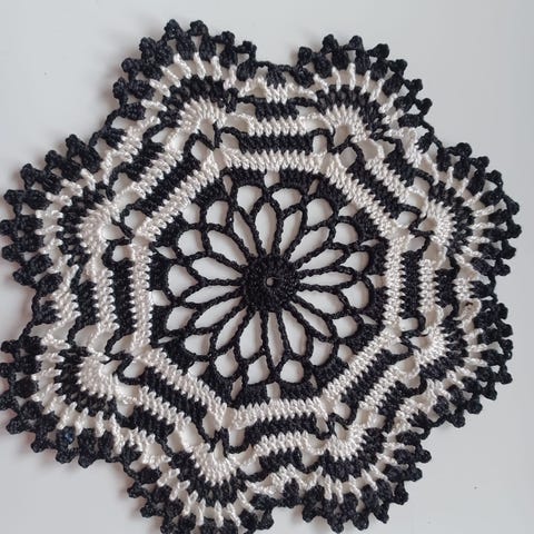 Itsetehty pyöreä punavalkoinen virkattuliina, halkaisija n 21cm. Koristeellinen kukkakuvio ja pitsireunus. Materiaalina merseroitu 100% puuvillavirkkauslanka.